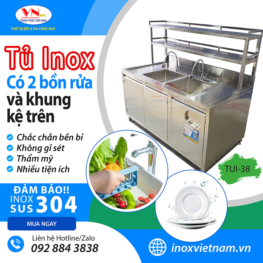 Tủ Bếp Inox Có 2 Bồn Rửa Và Khung Kệ Trên TUI-38