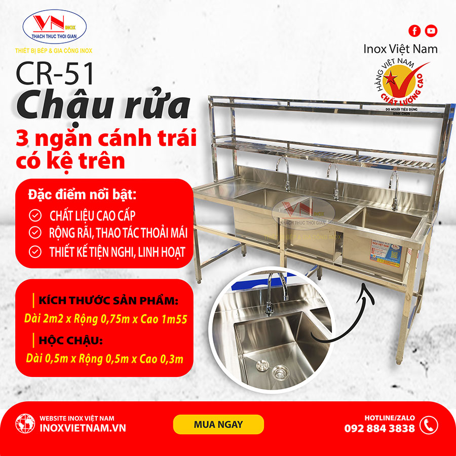 Sản phẩm Chậu rửa chén 3 ngăn công nghiệp cánh trái có kệ trên CR-51 của thương hiệu Inox Việt Nam. Là một thiết bị bếp công nghiệp có nhiều ưu điểm vượt trội, giúp việc sơ chế thực phẩm và rửa chén bát trở nên thuận tiện, hiệu quả hơn.